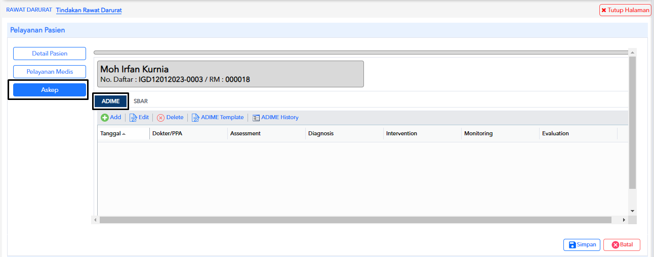 Anda dapat menambahkan data ADIME jika pasien mendapatkan layanan asuhan keperawatan dengan klik tombol “Add”. Dalam proses pengisian data ADIME Anda juga dapat menambahkan data dengan klik tombol ADIME Template atau ADIME History,